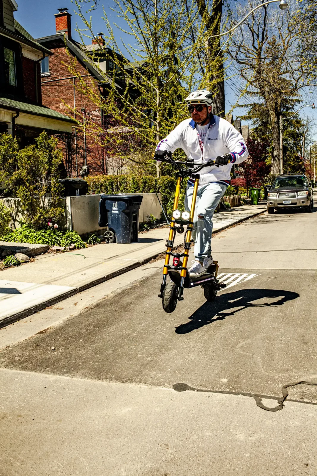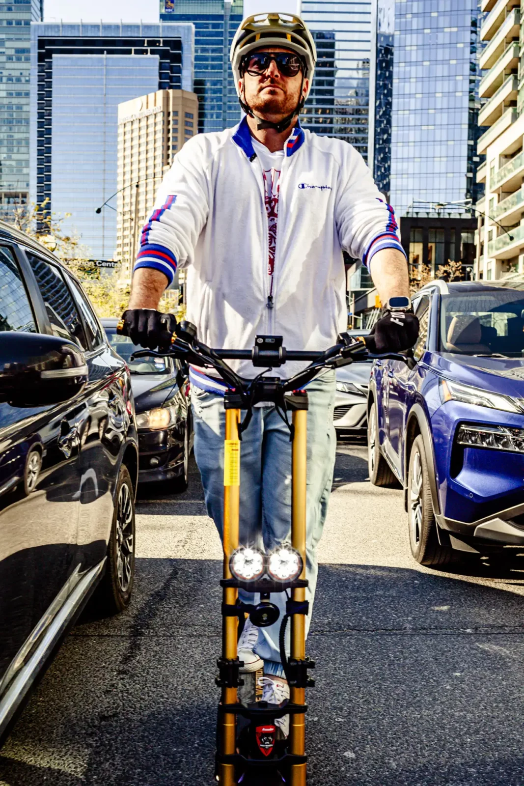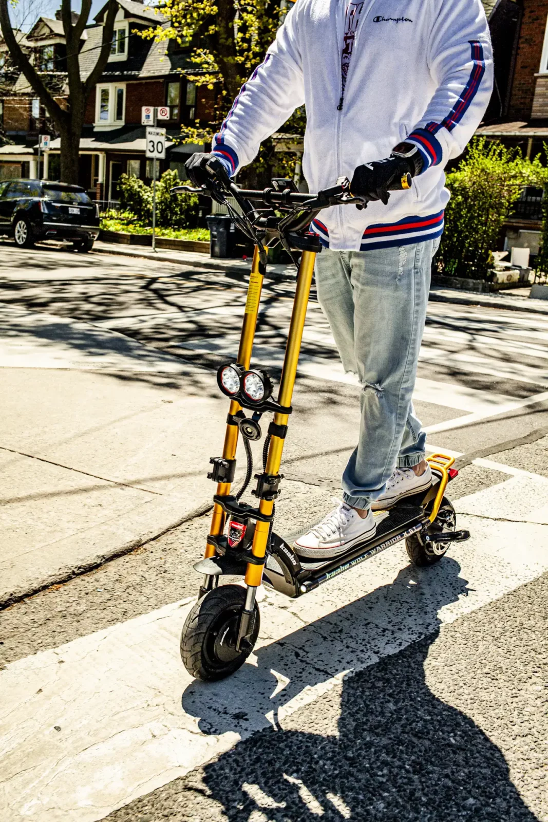 The Wolf Warrior X GT electric scooter is the only model with this dual clamp folding mechanism for the front fork, which makes it faster and easier to fold than other Wolf scooters. To fold the stem down for transport, simply open the clamps on either side, loosen the bolts on the clamps so you can slide them upward. Next, you’ll be able to fold the stem toward the deck.